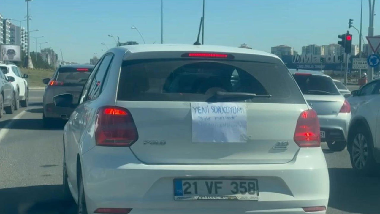 Merkez Kayapınar ilçesi Mezopotamya Bulvarı’nda kadın sürücü, otomobilin arka camına “yeni sürücüyüm, sabır imandandır” yazılı not yapıştırarak trafiğe çıktı. Trafikte dikkatli ilerleyen sürücünün o anları ve yazısı cep telefonuyla kayda alındı.